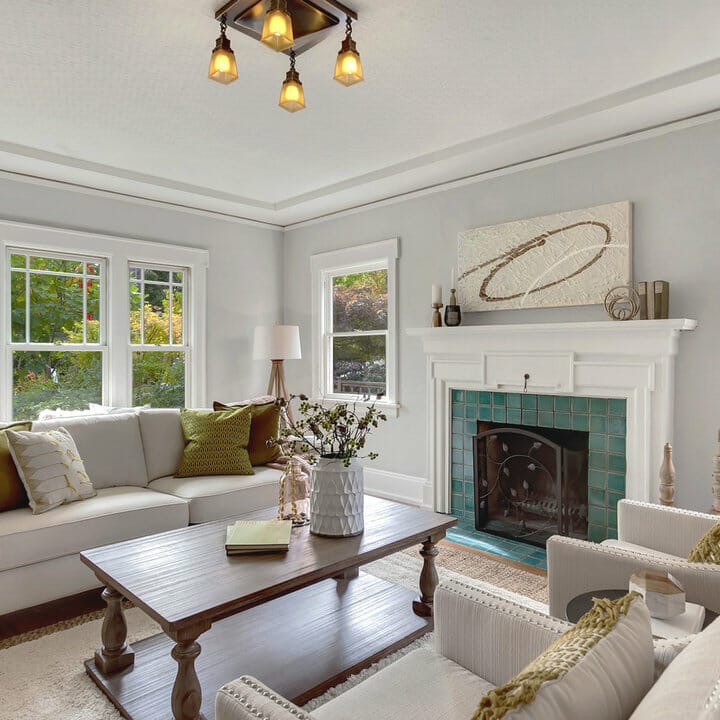In this modern cottage living area, turquoise square tiles take center stage. Moreover, they carry both freshness and vintage charm to the interior.