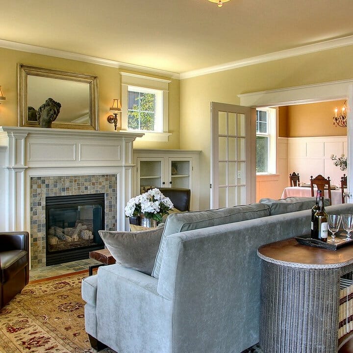 The fireplace facade and hearth boast vintage square tiles. Moreover, their varying blue shades exude carefree vibes while creating a fresh look.