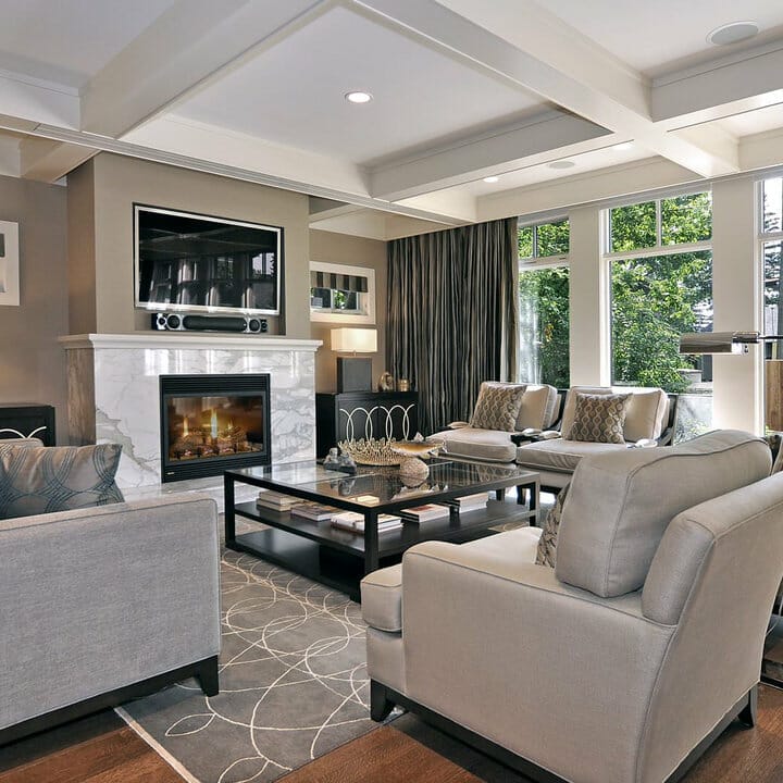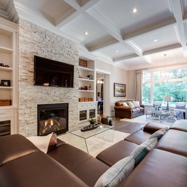 There’s a streamlined TV over the glass fireplace. Moreover, the recessed glass-front cabinetry and shelves fit in with the coffered ceiling. Meanwhile, assorted embellishments distract attention away from the uninteresting television.