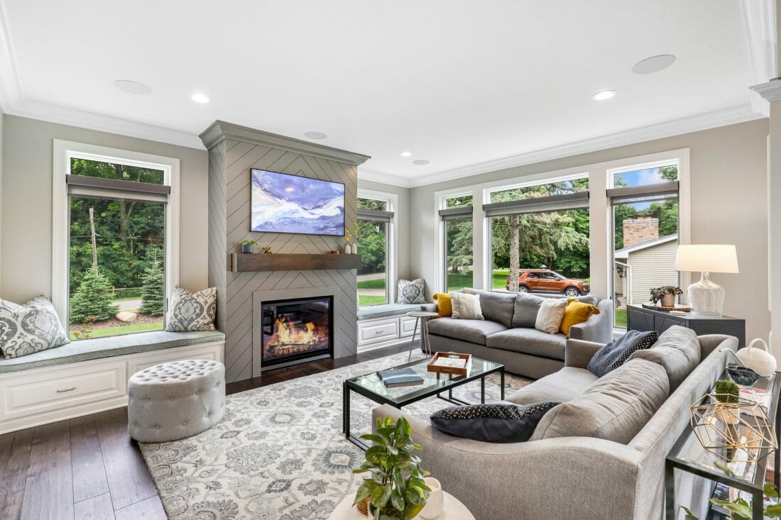 Window seats flank the chevron fireplace wall. Moreover, they boast drawers, gray cushions, and matching printed decorative pillows. Mustard yellow accents and woodsy hues warm gray elements up.