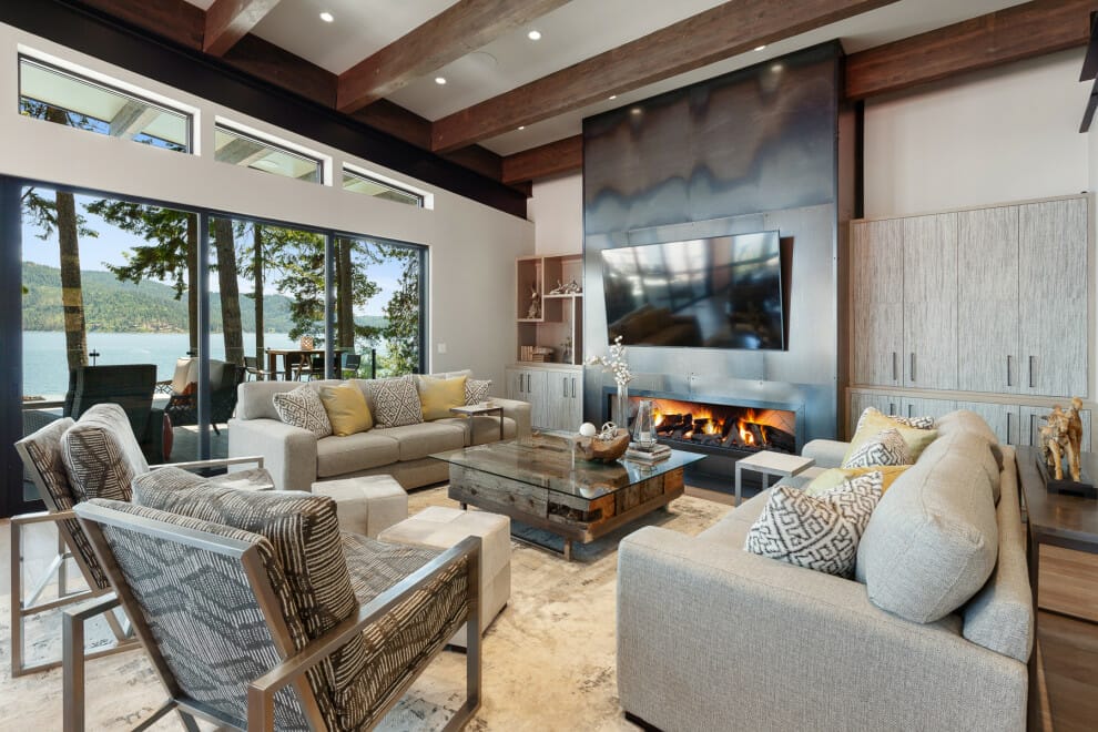 The fireplace injects the lake house with homey vibes. Bare wood decorative beams effortlessly temper its cold metal panels.