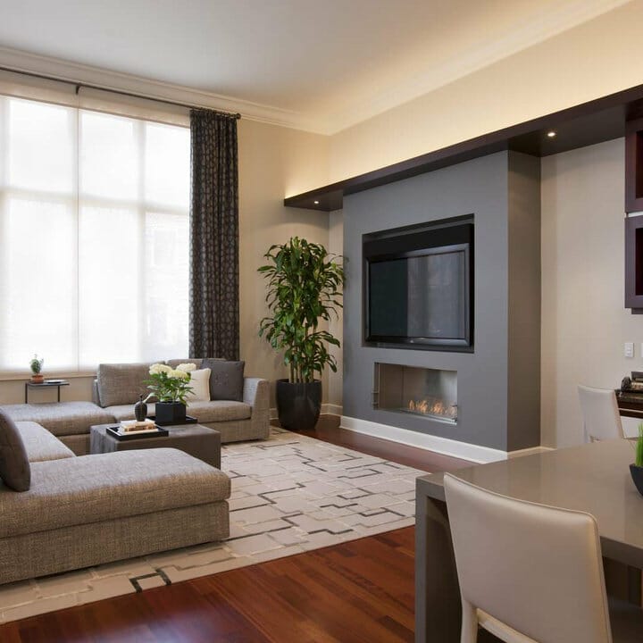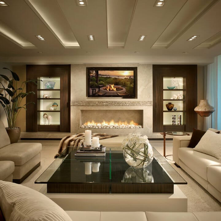 Beige and white are dominant, so the seating area feels airy but still welcoming. The subtle focal wall employs a stylish fireplace and a TV.