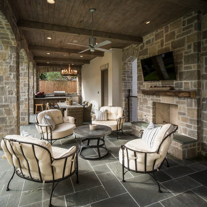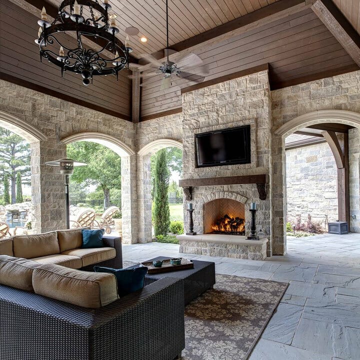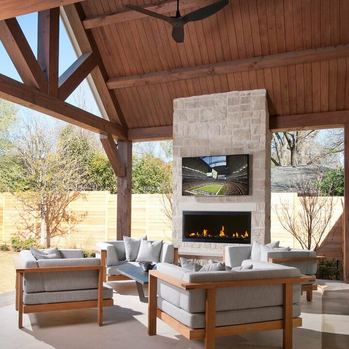 If outdoor-indoor living appeals to you, consider a few of my fireplace wall ideas with TVs. The fireplace-television combo makes this covered space attractive.