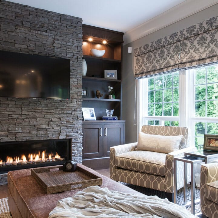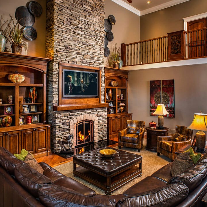Here, the coziness of the fireplace will wow visitors, of course. Meanwhile, the TV right above the textured limestone mantel lets the homeowners entertain their guests.