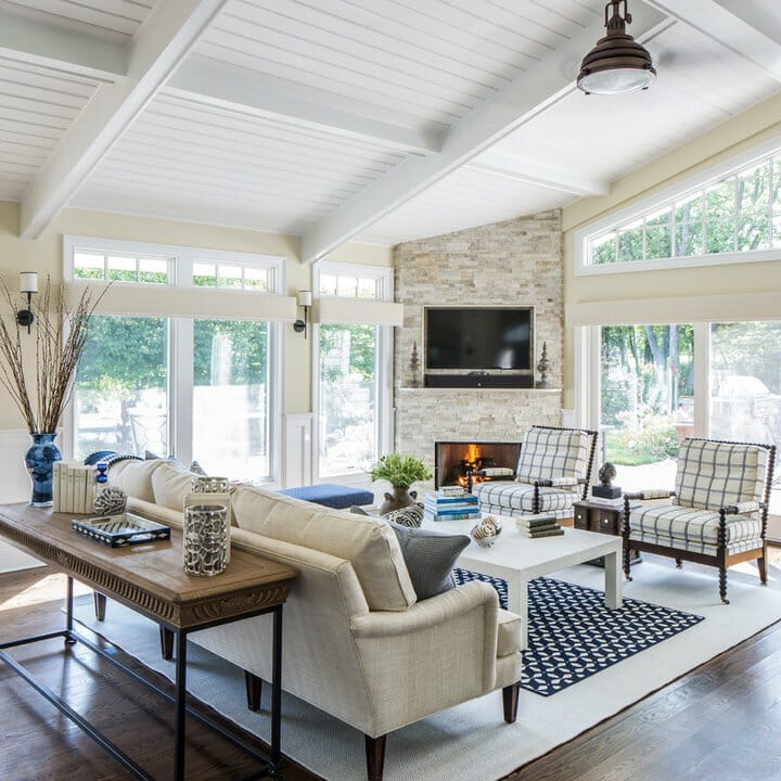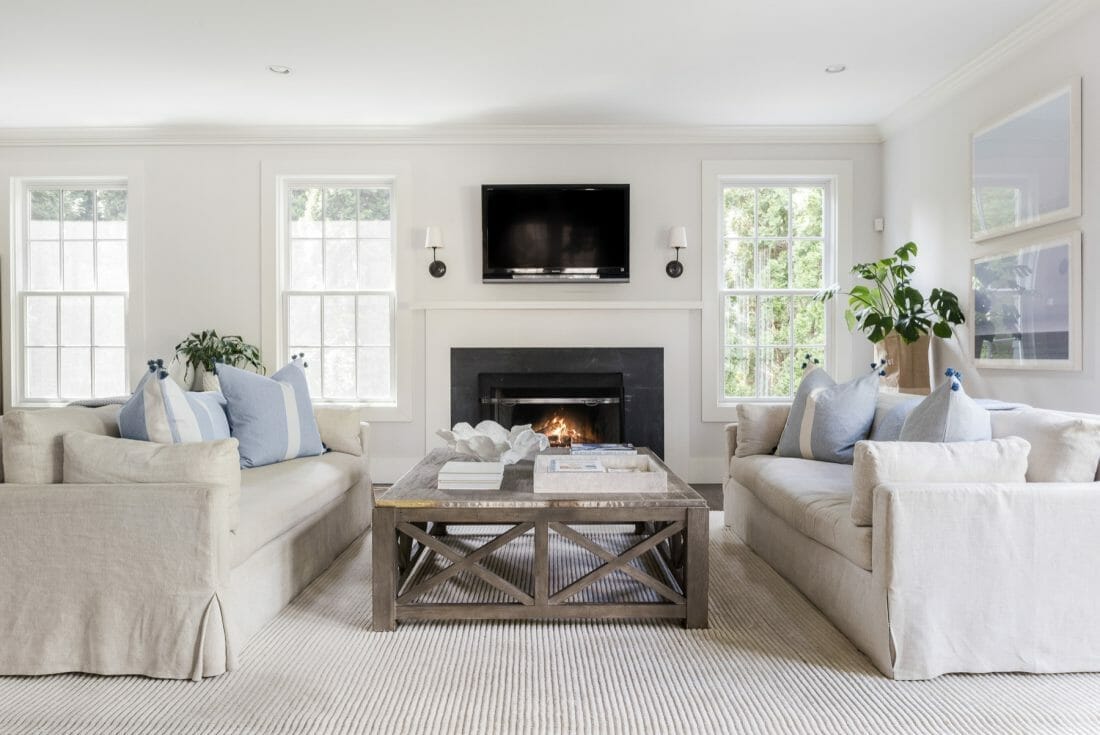 If your abode isn’t enormous, emulate this layout. The white board-and-batten focal wall meets the ceiling and windows seamlessly. Also, it boasts a cabinet with a sliding door that hides the television when switched off.