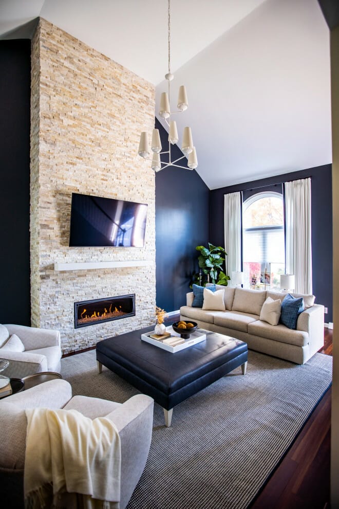 The ceiling-to-floor focal wall marries a floating TV with a built-in fireplace. Furthermore, it boasts skinny textured tiles of limestone for a rustic look.