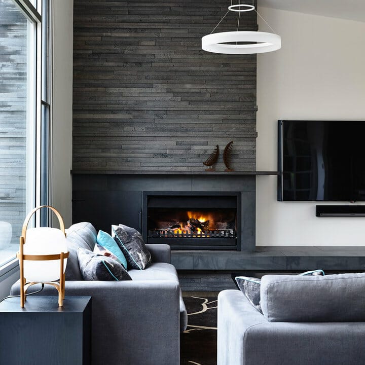 The slate wall is the living room’s highlight undeniably. Also, it accommodates a rectangular television and a gas fireplace while imparting texture.
