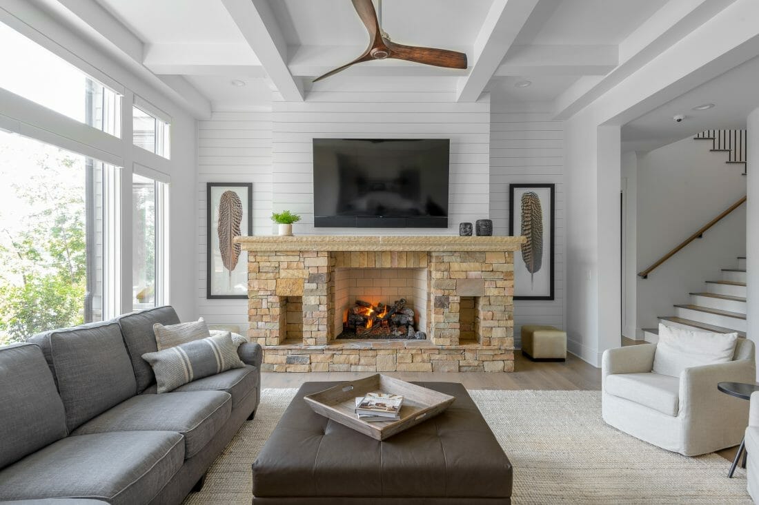 Next to the gray fireplace wall is a statement indoor plant. Moreover, the potted greenery on the square ottoman and side table carve a cohesive, finished feeling.