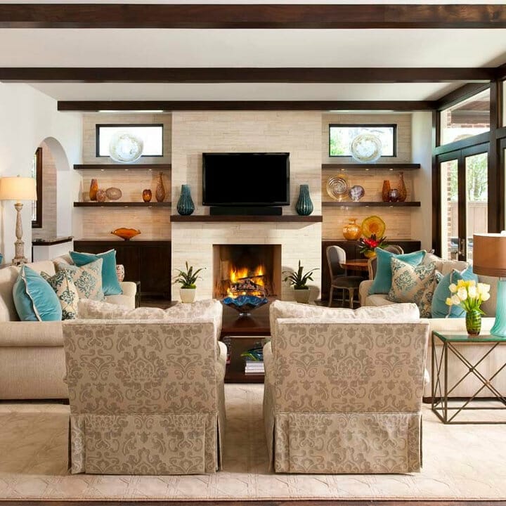 If you’re into traditional-style fireplace wall ideas with TVs, luck is yours. I love the wooden TV frame design here. It seamlessly suits classic storage units that employ cabinets and open shelving.