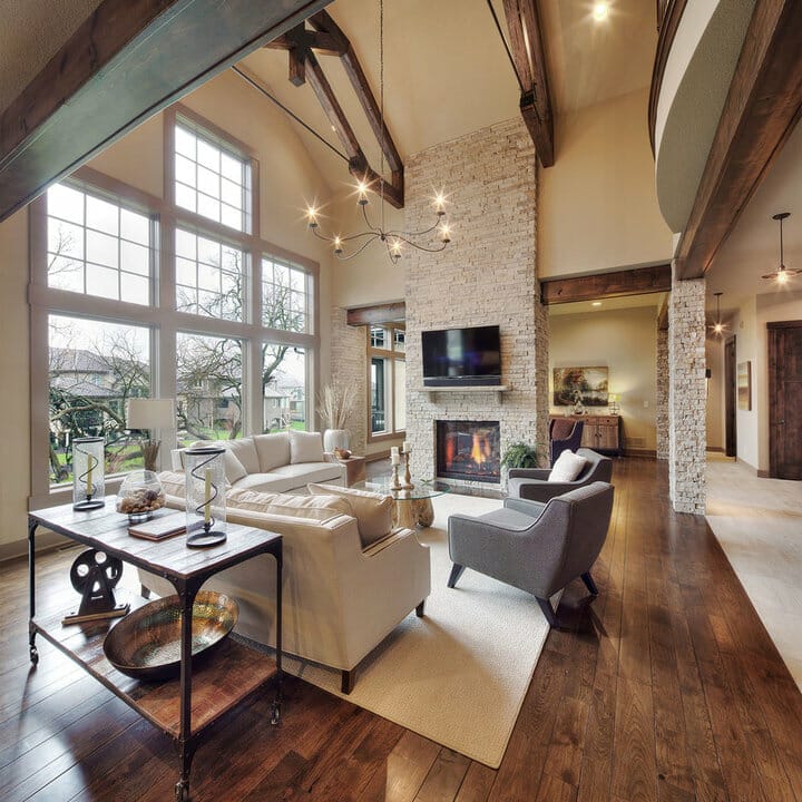 This living area hypnotizes me in seconds. Not only does it feel serene but also looks luxe and exquisite. Also, the fireplace has matching river rocks.