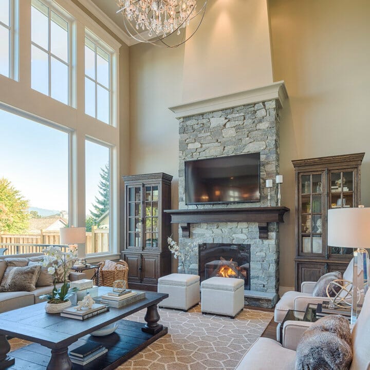 5. Fireplace Surround Ideas with TVs and Giant Windows