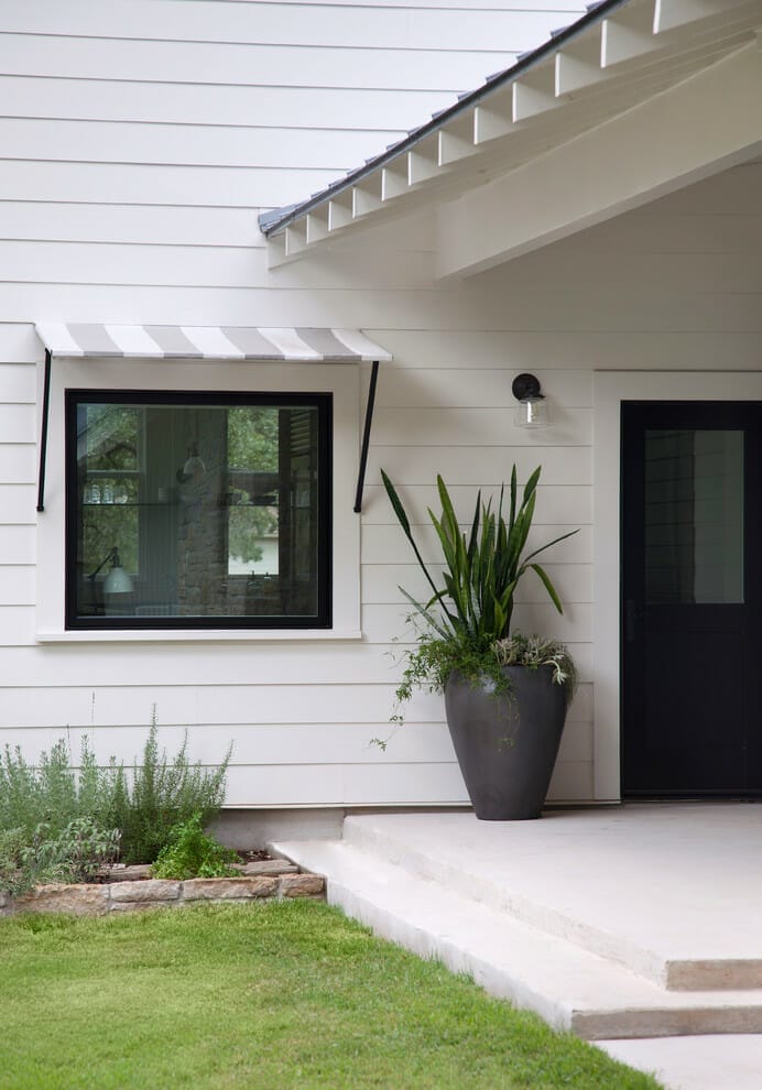 From trees to low-growing shrubs, this front porch has a bunch of greeneries that enliven the all-white palette behind them.