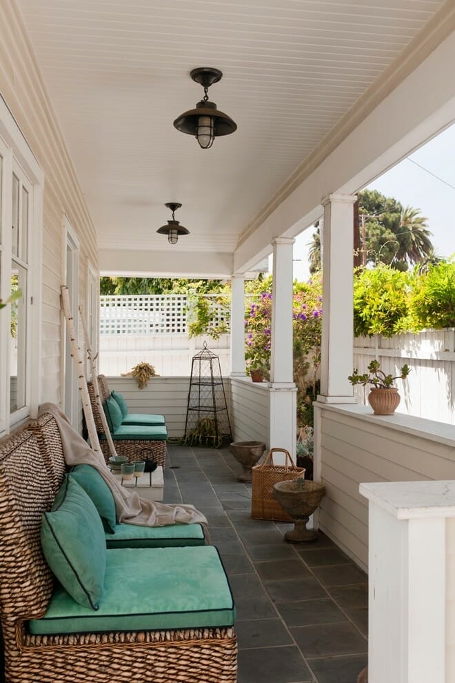 Speaking of bohemian furniture for front porch ideas, try integrating assorted furnishings. This multifunctional gathering space boasts rattan furniture pieces. The daybed and end tables certainly produce symmetry here.