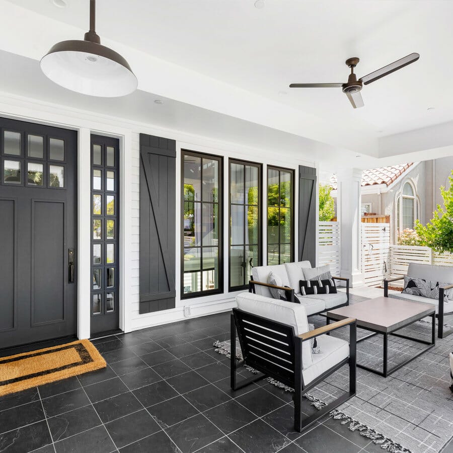The ceiling fan cools down the front porch on hot days. Moreover, the jute doormat, rug, and artistic pillows keep the black-and-white gathering space from being stark.