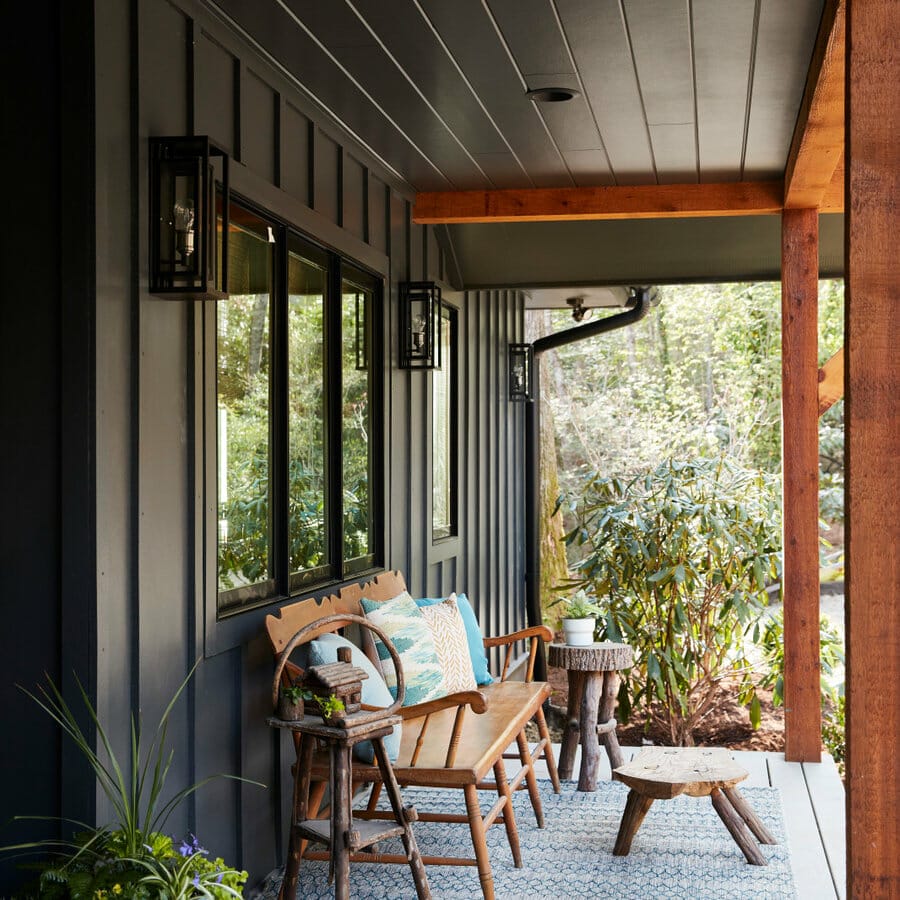 The black vertical siding and window frames add depth to this compact front porch. Also, the gray floor and printed rug brighten them up.