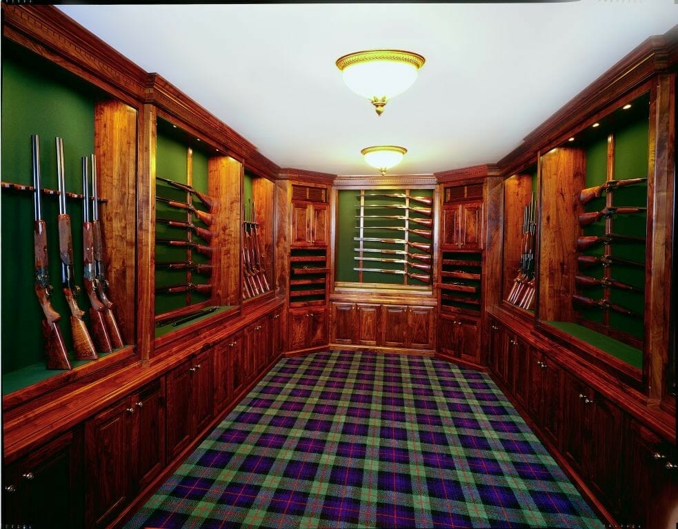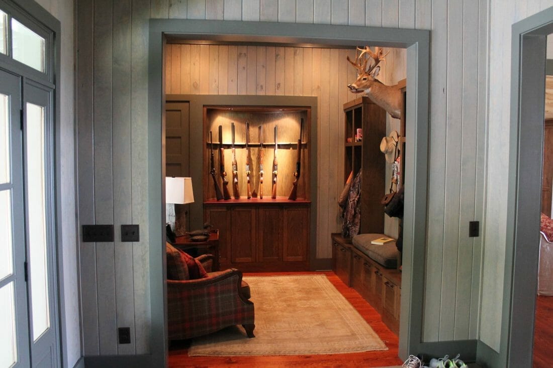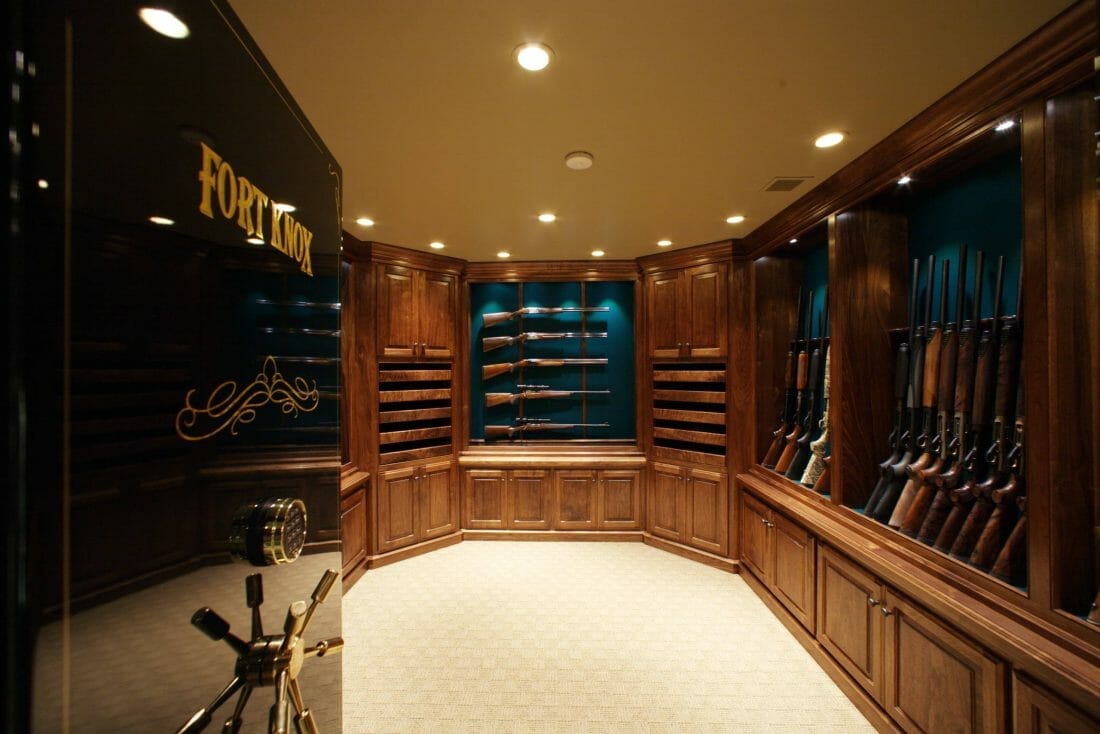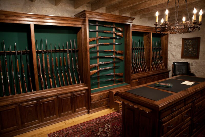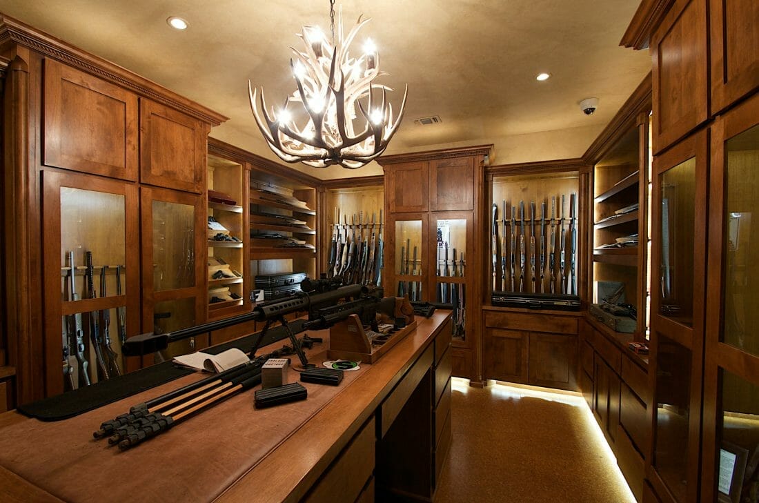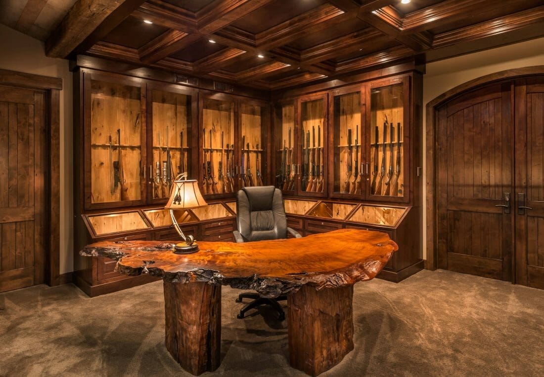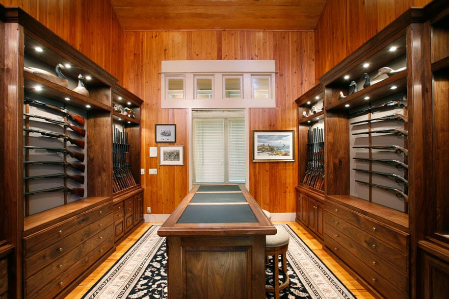 Here, the custom hardwood cabinets keep firearms in place. Furthermore, they inject visual symmetry while depicting lasting warmth.