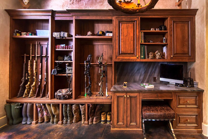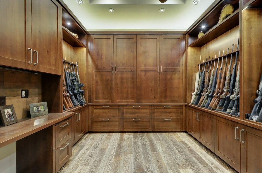Speaking of gun room ideas, you never go wrong with hardwood cabinets. Not only are they timelessly charming, but also embody a sense of intimacy.
