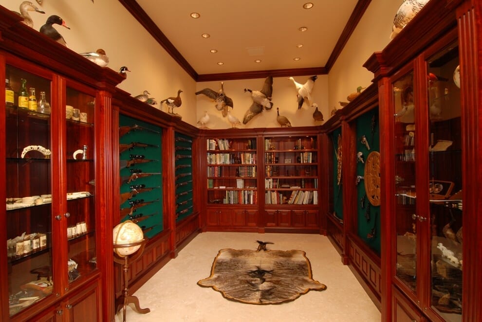 The beige flooring allows the deer hide rug and floor globe to be more noticeable. Meanwhile, cabinet-top and wall-mounted bird decorations adorn the gun room. Recessed puck lights brighten the home armory at night.