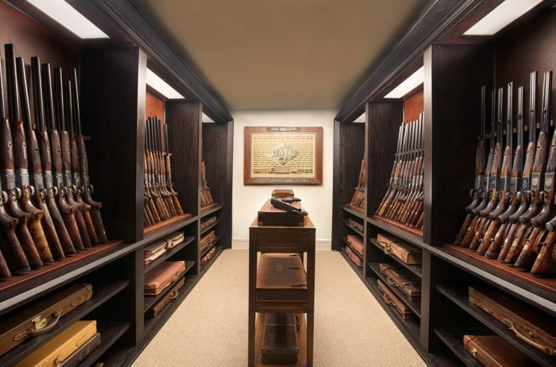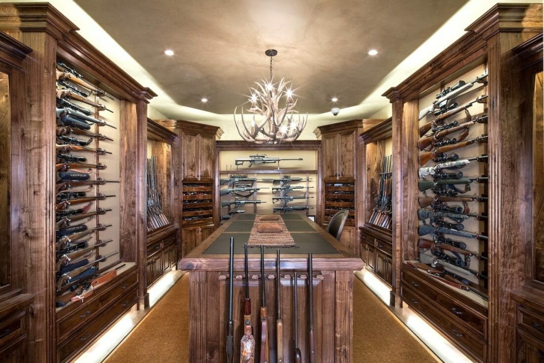 There’s also custom wood cabinetry in this gun room. Furthermore, racks and gray backdrops emphasize guns excellently. Top shelves display statues of varying birds.
