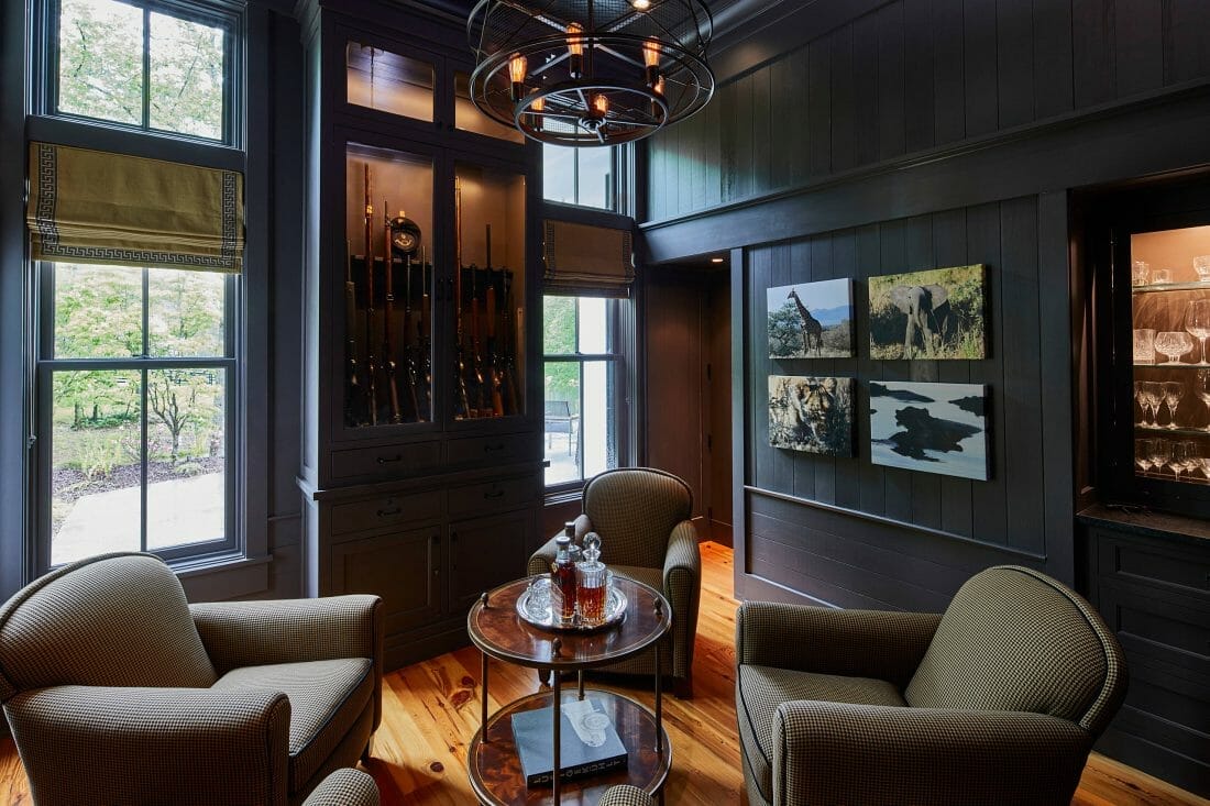 The iron chandelier carves a masculine appeal. Moreover, glass-front cabinets showcase drinking glasses and firearms. Meanwhile, windows ensure the gun room doesn’t seem dingy.