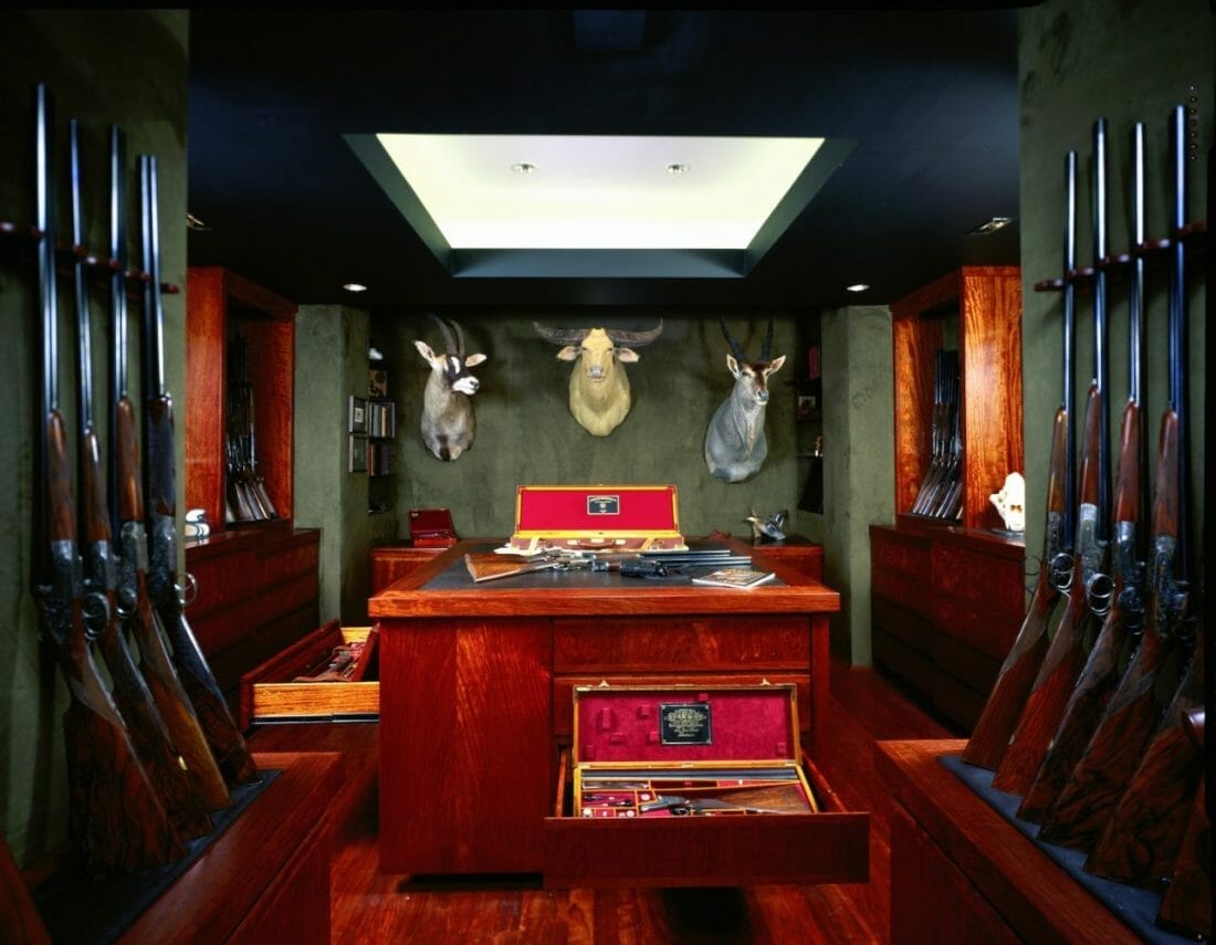 Here, the racks showcase vertical arrangements of firearms. Furthermore, the island enables the homeowner to reload his guns. Artworks and animal heads enliven the earthy green walls.