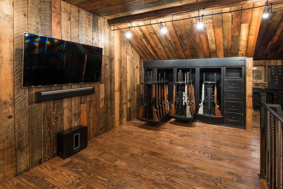 This gun room combines firearm displays with the man cave. Meanwhile, hardwood shelves showcase hunting guide books and sentimental decorations.