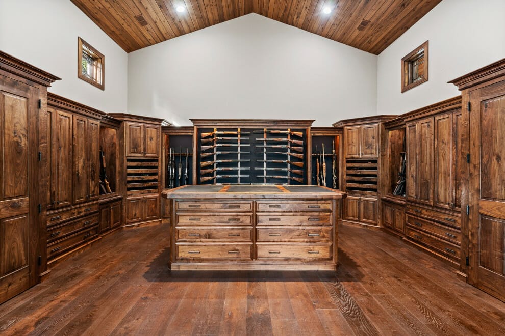 Who doesn’t want to acquire this gun room? It’s nothing short of magnificent. The cherry hardwood flooring, island, and cabinets introduce a seamless look. Meanwhile, the black-and-white tray ceiling injects interest.