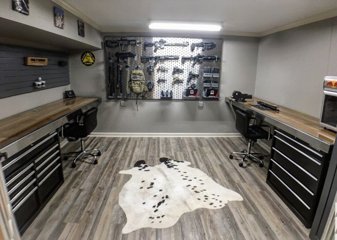 The central island accommodates a pale gray stool. It lets the homeowner clean his firearms while keeping the gun equipment off the floor.