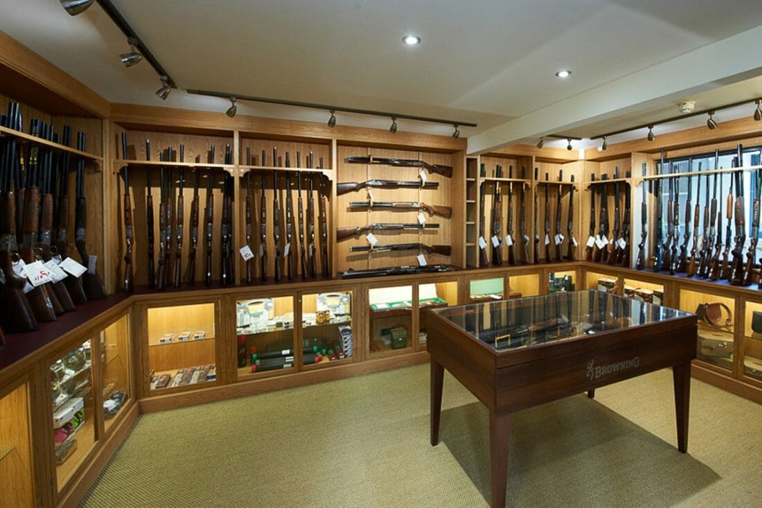 Glass-front cabinets show neat arrangements of rifles and guns. Meanwhile, touches of color keep the gun room blandness at bay.
