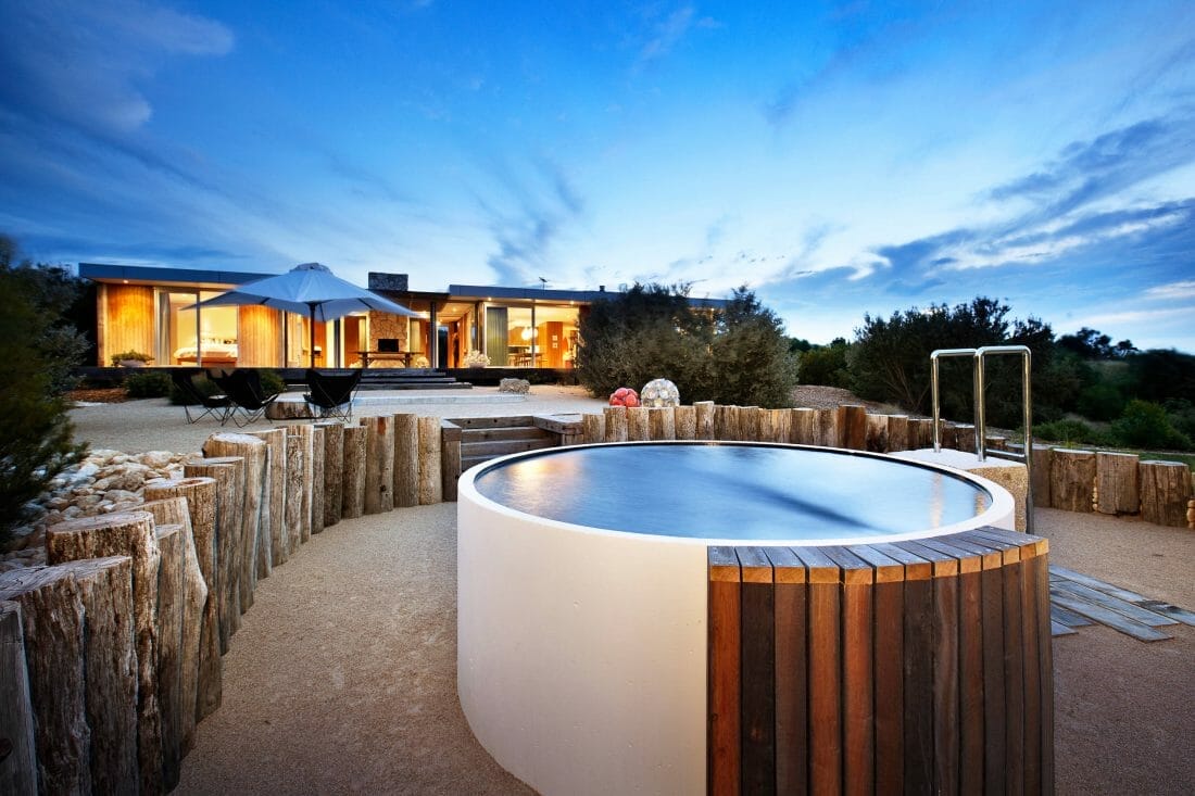 The tiered slatted timber fence and sand-painted siding develop an inviting look. Moreover, pale stone patio flooring blends seamlessly with the hot tub.