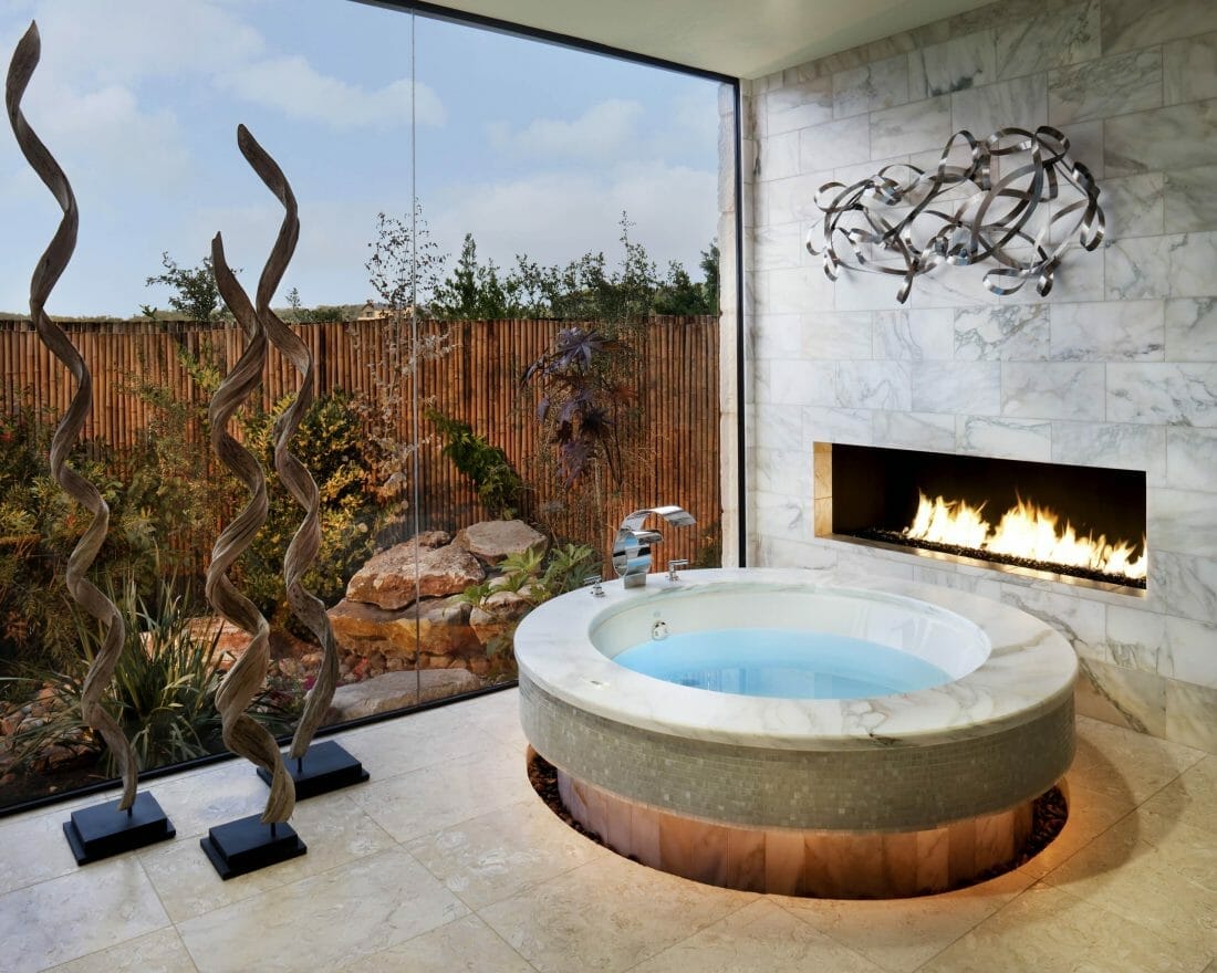 This private sanctuary is undoubtedly a work of art. The marble hot tub surround and fireplace tiles offer a glam effect. Meanwhile, the gray mosaics and soft white floor tiles let you relax in total tranquility.