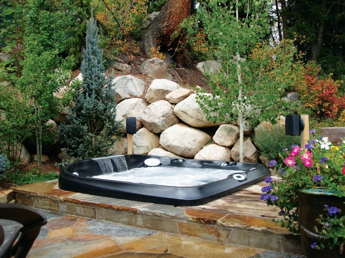 The black hot tub creates drama while boasting a water feature. Evergreens and tall trees spice up bare boulders. They help boost your privacy as well. Meanwhile, vivid flowering plants carve a stunning scene.