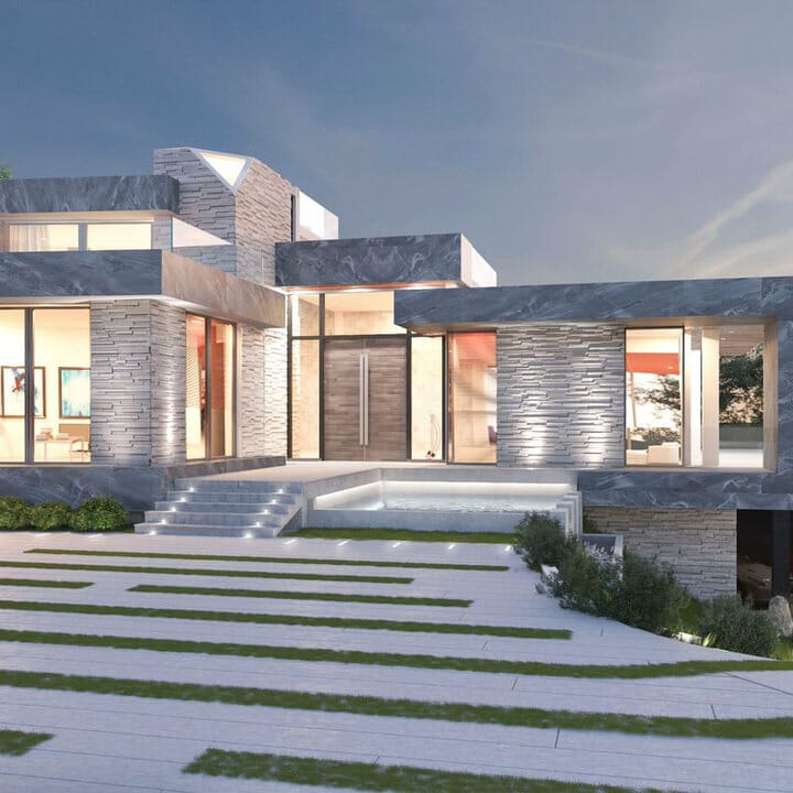 Small evergreen shrubs emphasize the marble walkway. Meanwhile, cherry wood accents temper the asphalt driveway and intense gray elements.