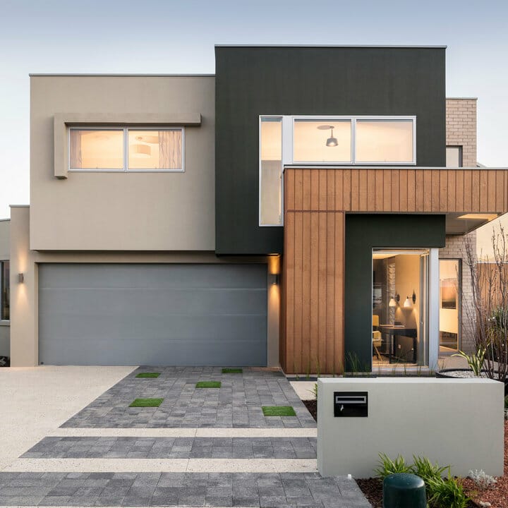 There’s a minimalist tree too. If you like the thought of growing it, ask council permission first. Moreover, timber cladding and concrete panels introduce a splendid contrast. The industrial-style garden and wall lights lend the front facade a warm nighttime glow.