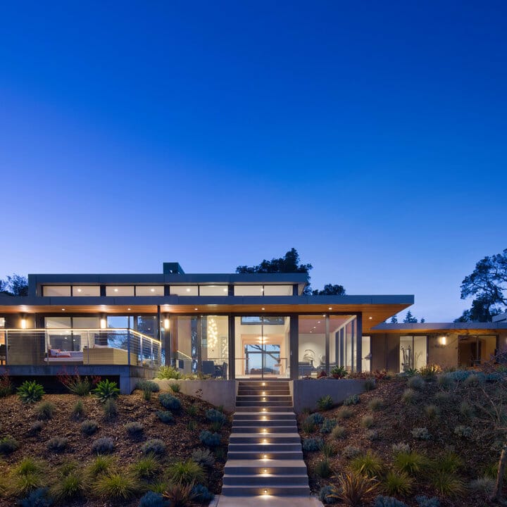 Flat roof lines mingle with concrete entrance steps that employ recessed garden lights. Assorted small ornamental grasses offer the sloped yard visual interest.