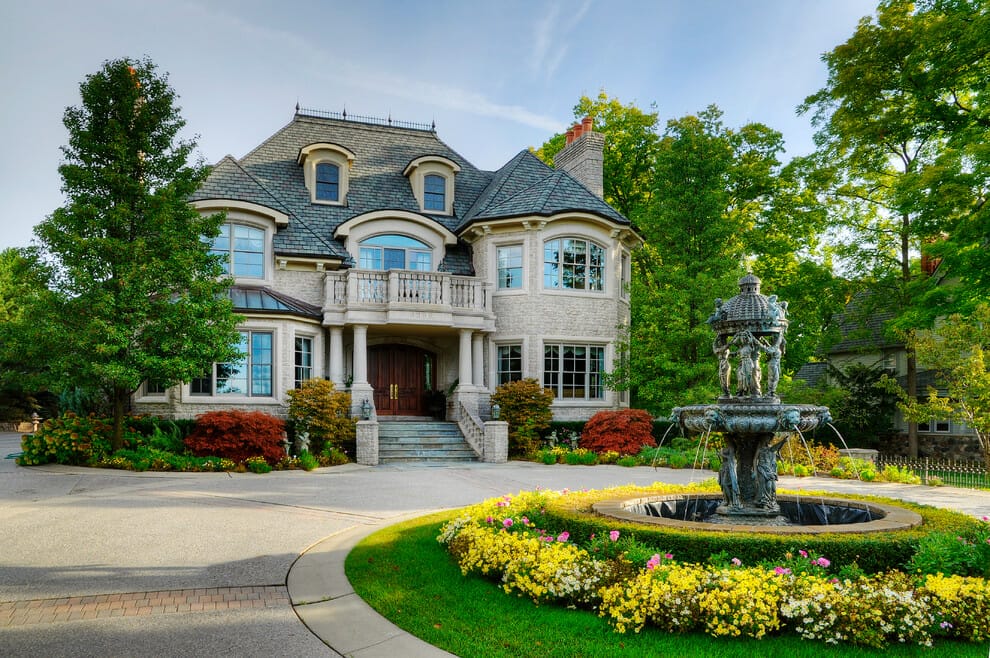 Additionally, the front yard garden introduces a riot of color while employing whimsical statues. Also, there’s a traditional fountain that portrays splendor and tranquility.