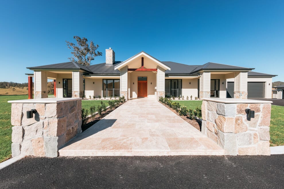 Cream and yellow limestone bricks define this modern house frontage. Furthermore, they offset the gray shiplap siding and front entry steps.