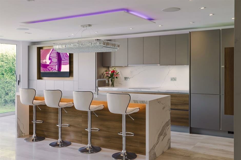 A contemporary kitchen full of white will be too monotonous to look at. Therefore, you can give a short statement by installing LED light strips in warm yellow in several spots.