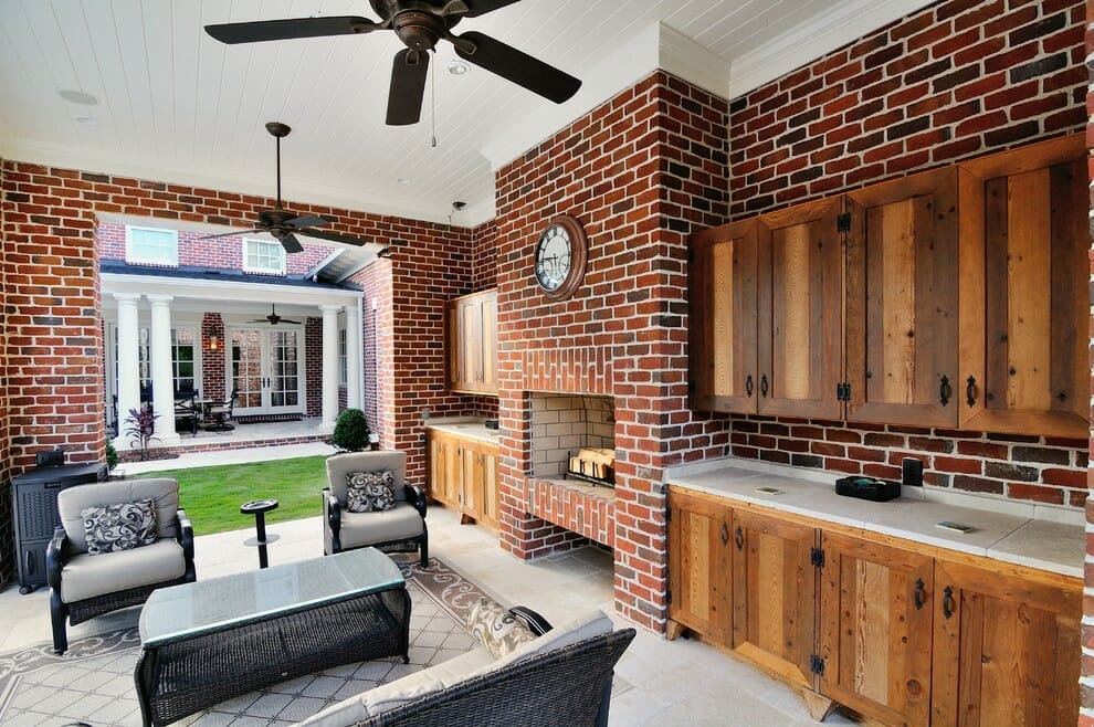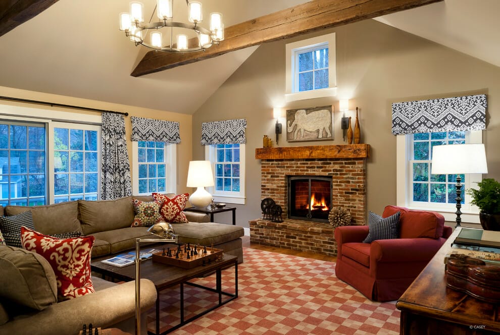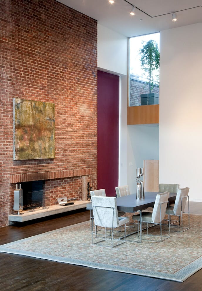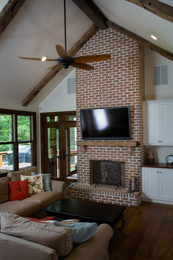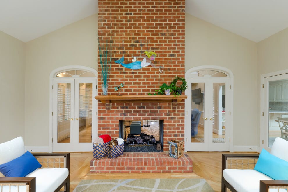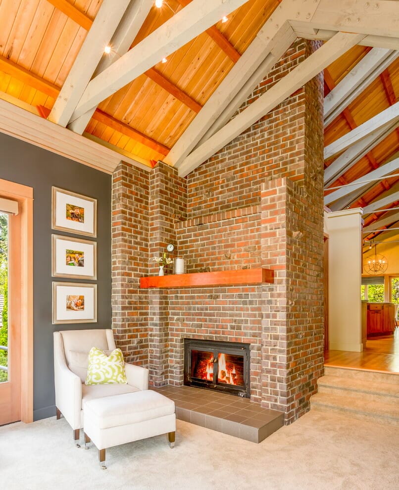 The red bricks on this fireplace surround run all the way up to the ceiling to offer a sense of height.