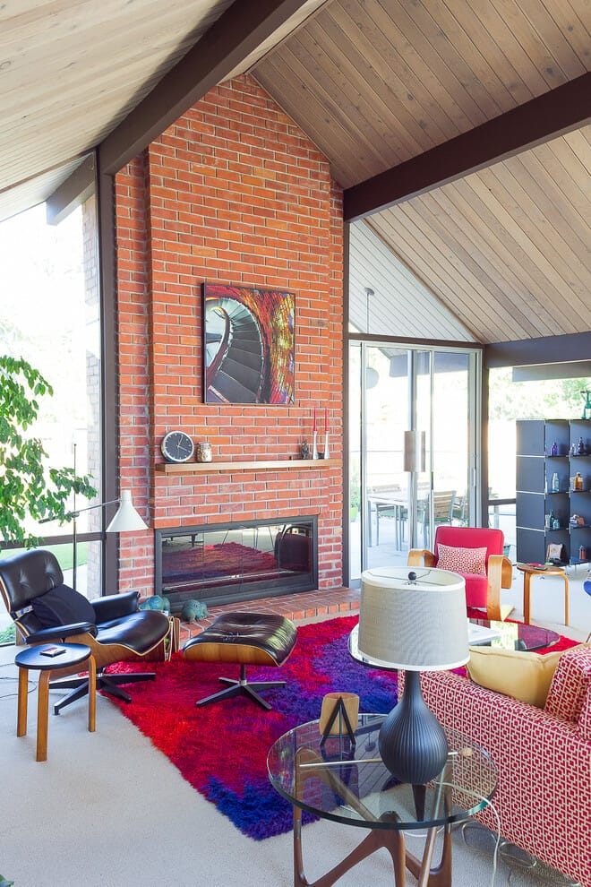 Then, the red brick fireplace is there to make a unique statement and keep a sense of dullness away.