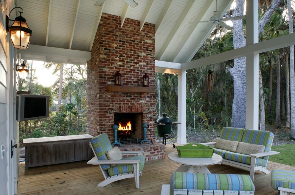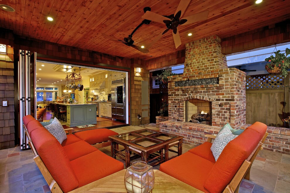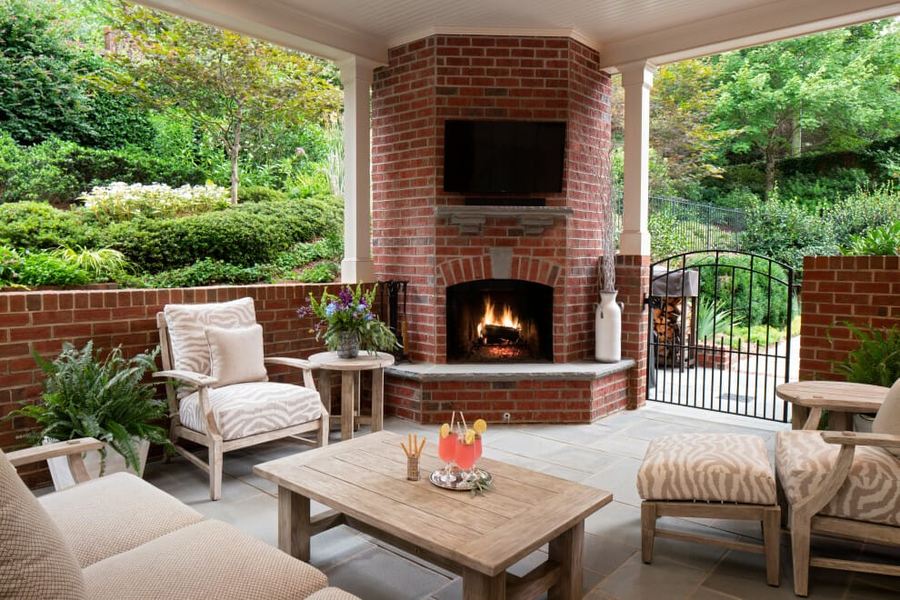 Lastly, you can bring the comfort of your interior outdoors by incorporating a functional fireplace and a set of furniture.