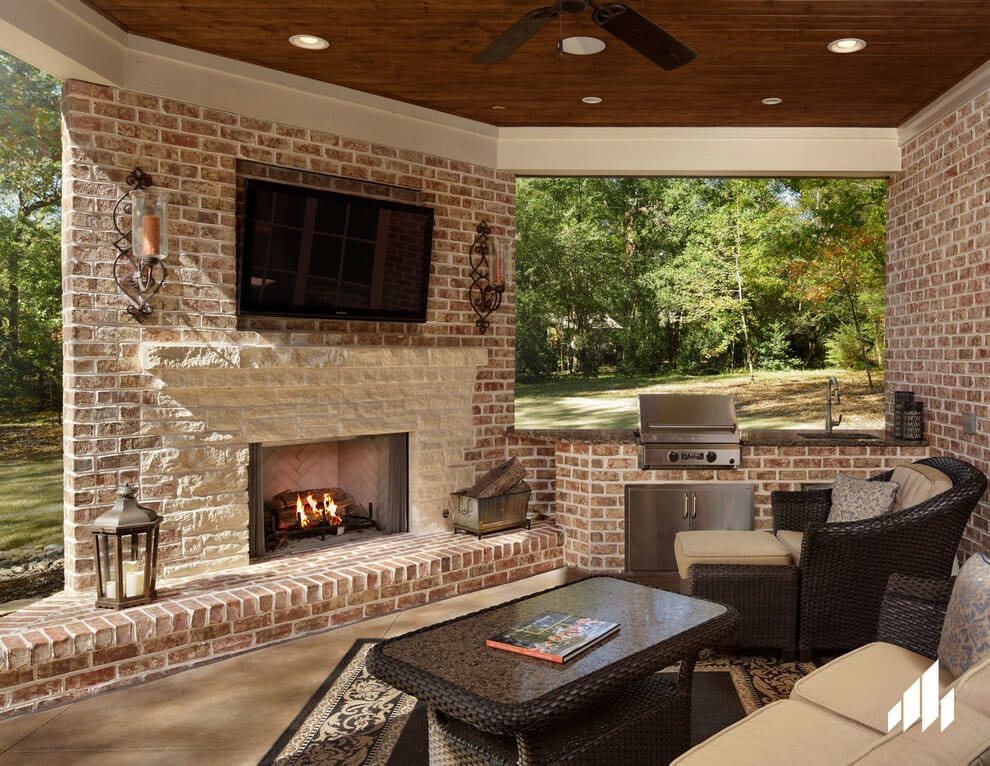 Additionally, a TV is mounted over the fireplace along with the wall sconces for a boost of function and beauty in this outdoor living room.