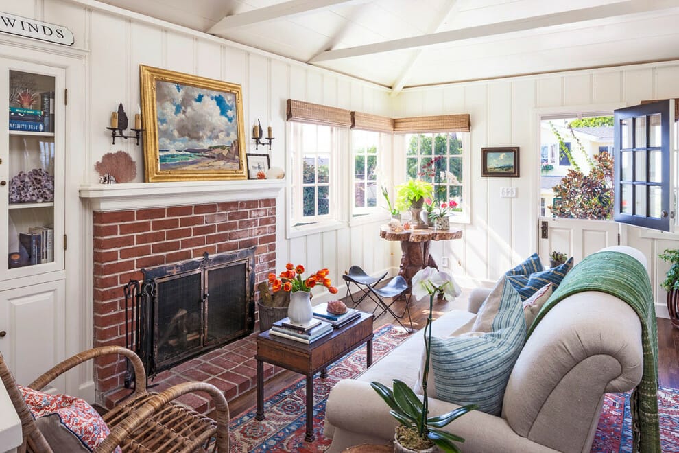 Then, to soften the look of your red brick fireplace, you can whitewash the surface and keep the decoration minimal.