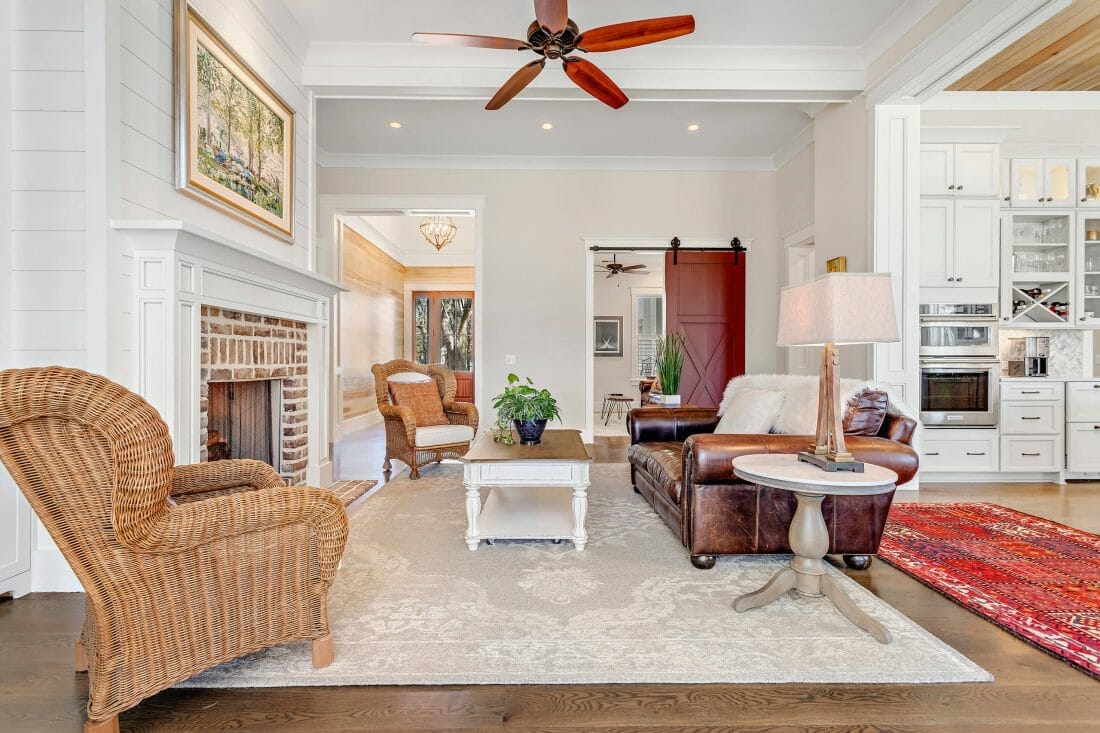 Mirroring the tone of the red brick fireplace are the rug runner, barn door, and chandelier. Complete the subtle look of this living area by incorporating a matching artwork.