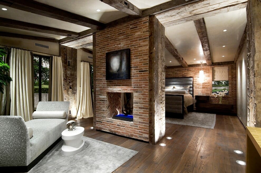 This master bedroom looks perfect with the standalone red brick fireplace, exposed ceiling, and hardwood flooring.