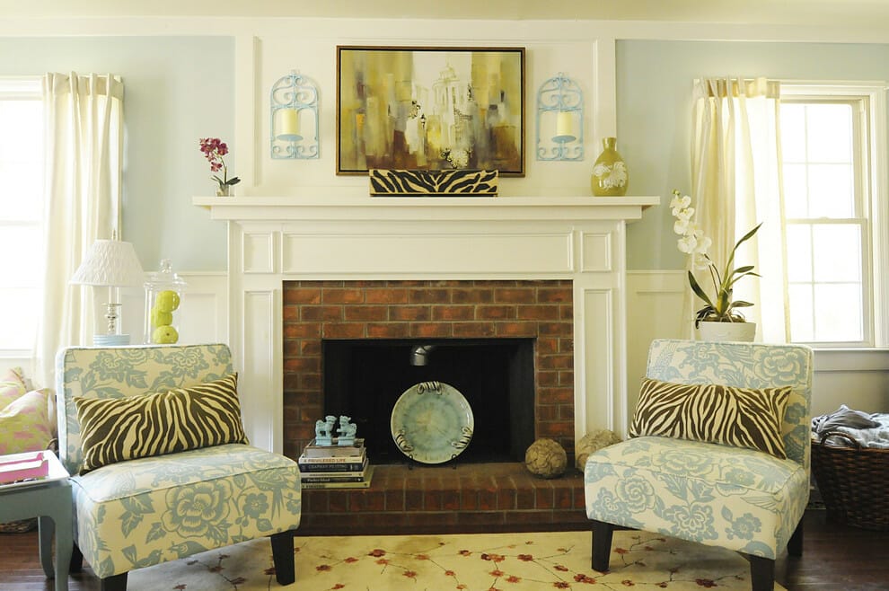 You can easily find several shades of blue in this living space, from the floral pattern on the individual sofas to the fireplace decorations.