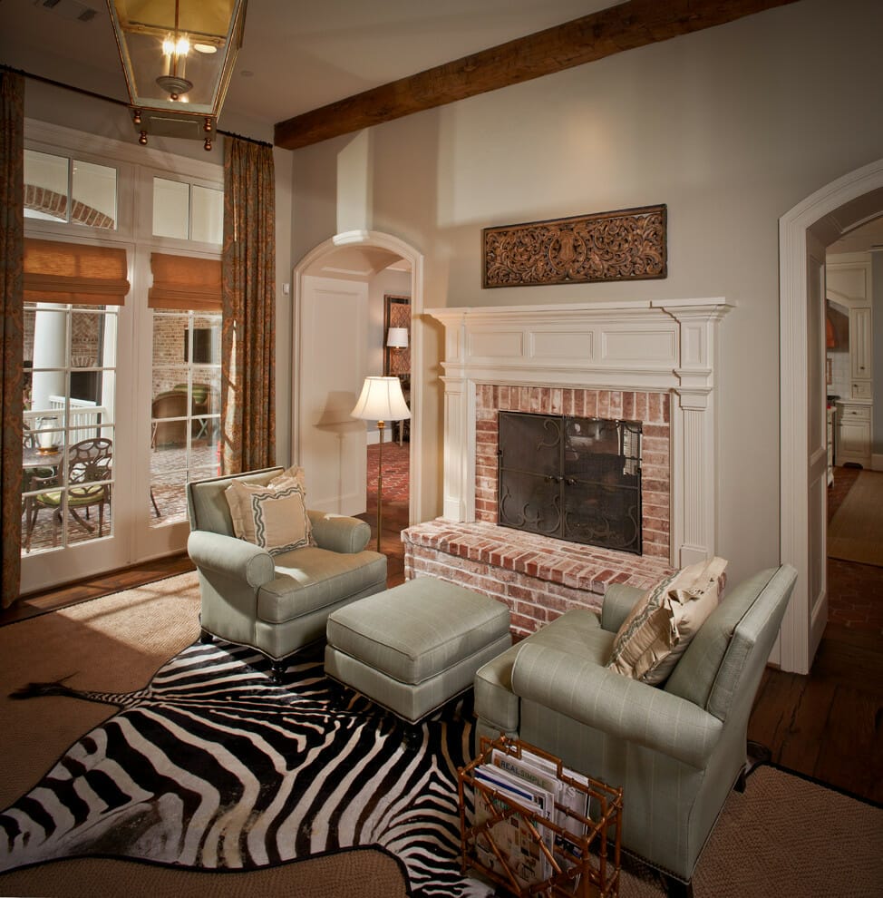 Give a little twist to your traditional red brick fireplace by incorporating dark-colored stones in its surrounding.