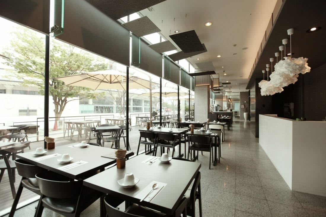 This restaurant looks serene and decent with minimal accessories. All you can see are white walls white simple photographs, exposed wooden beams, and a sleek concrete floor.