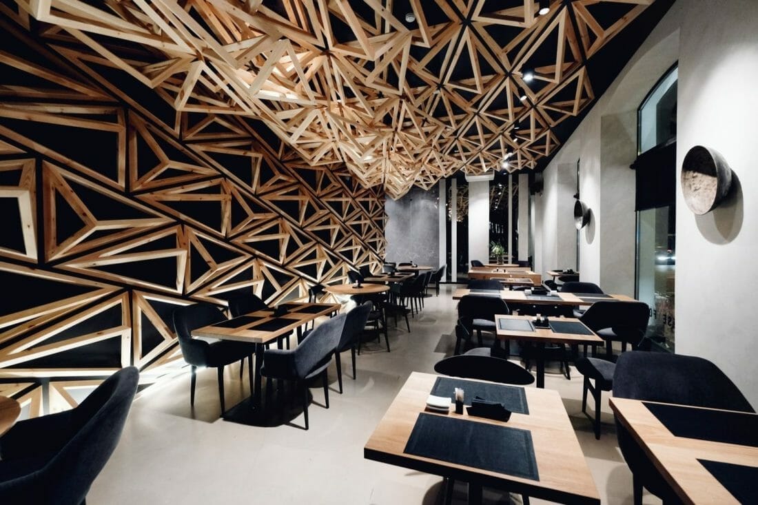 This restaurant features wooden triangles that cover a wall up to the ceiling. The geometric shapes lend a modern look while adding a pattern to the space.