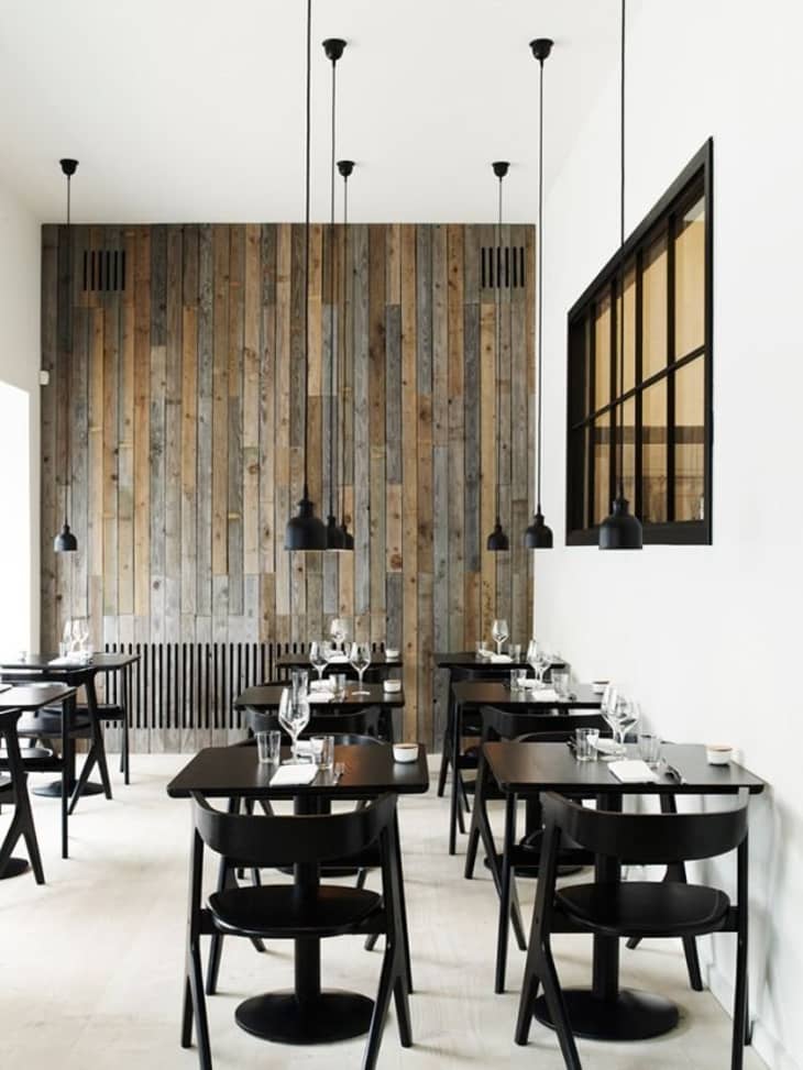 The use of a monochromatic color scheme tells you that this restaurant adopts a modern style. To make it look more attractive, you can add a bit of rustic touch by installing pallet wood to create an accent wall.